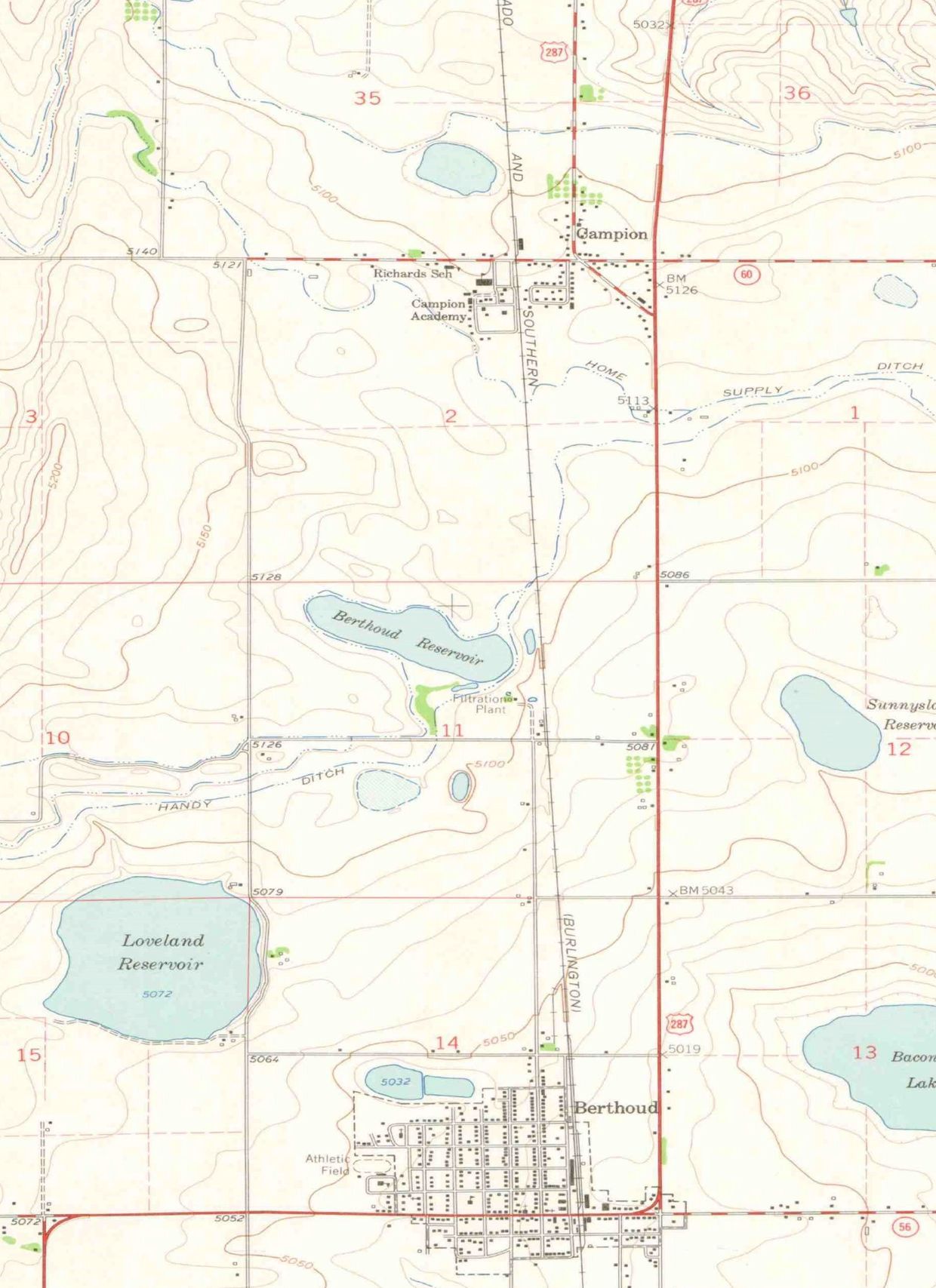 To stay on Historic US-87, North of Longmont, US-287 now bypasses Berthoud. To stay on the historic route, turn right heading Northbound off US-287 onto CO-56. Follow CO-56 to 1st Street and turn left to head North. If coming Southbound, take the exit for Berthoud onto 1st Street, and right onto CO-56. As a bonus, Campion's Garfield Ave/19th Street is also the original US-87 alignment and was US-287 until bypassed and decommissioned in the 1960s. (Image USGS Map)